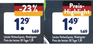 - Verwenden Sie eindeutige Bezeichnungen: z. B. „ehemaliger Verkaufspreis von XY € (innerhalb der letzten 30 Tage)“.